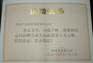 在本月初召開的“2010年慈善南通主題專場文藝晚會”上,產(chǎn)控集團(tuán)及其控股的上市公司南通科技和江山股份聯(lián)袂上臺接收市慈善總會發(fā)給的捐贈證書,被與會者視為佳話。 據(jù)悉,為幫助我市患大?。ò籽?、先天性心臟病、尿毒癥、惡性腫瘤)兒童,產(chǎn)控集團(tuán)定向捐贈兒童大病救助基金10萬元,南通科技和江山股份各捐贈20萬元,合計(jì)50萬元。