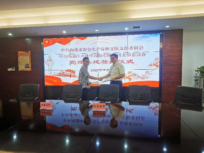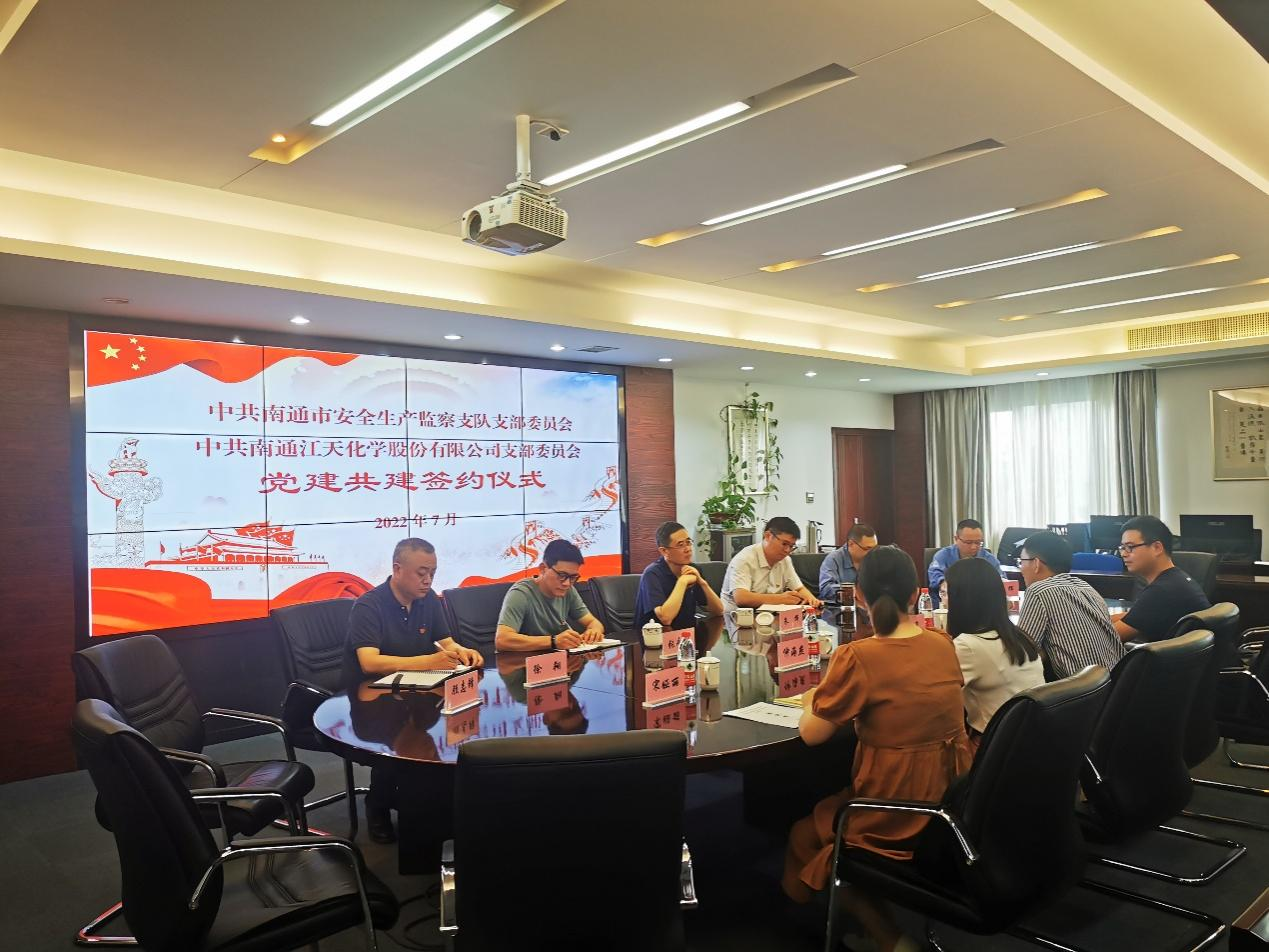 為認(rèn)真貫徹落實(shí)習(xí)近平總書記關(guān)于安全生產(chǎn)方面的重要論述,深化“紅色引領(lǐng) 綠色智造”黨建品牌建設(shè),深入推進(jìn)融合黨建實(shí)踐,提升安全生產(chǎn)管理工作成效。7月份,江天化學(xué)黨支部與南通市安全生產(chǎn)監(jiān)察支隊(duì)黨支部開展了黨建共建簽約儀式,進(jìn)一步加深合作交流,創(chuàng)新黨建結(jié)對共建形式。