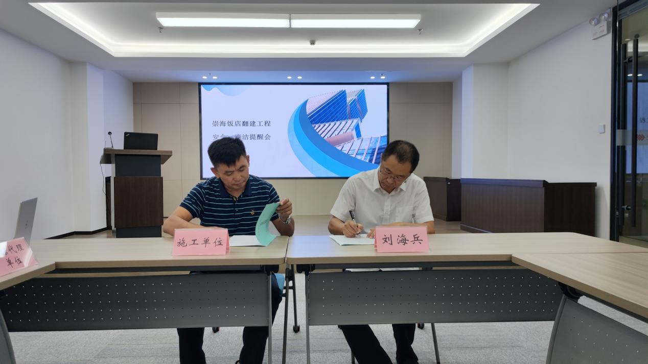 會上,國融公司黨委書記、董事長、總經(jīng)理劉海兵向與會人員介紹崇海飯店翻建項目具體情況。國融公司與相關(guān)合作方簽訂安全責任書、廉潔責任書,項目管理人員簽訂廉潔承諾書。