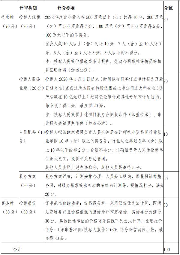 本項目采用綜合評標法,由產(chǎn)控集團評標小組對各投標人技術(shù)標和商務標進行綜合評審和評分。評分采用百分制,按總得分(技術(shù)標得分與商務標得分之和)從高到低的順序確定排名次序,總得分排名第一的投標人為中標人;如遇兩家投標人總得分排名并列第一時,則商務標得分高的投標人為中標人;如商務標得分一致,則通過抽簽方式確定中標人。技術(shù)標最終得分為所有評委評分的算術(shù)平均值,評分值均保留至小數(shù)點后兩位。 具體評分標準如下: