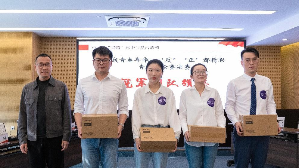 頒獎(jiǎng)環(huán)節(jié)公布了好書薦閱活動(dòng)中投票前十名的選手,他們將獲得集團(tuán)黨委書記《帶著工匠精神去工作》贈(zèng)書一本。吳玉祥為在“好書漂流、愛心無限——跳蚤書市”活動(dòng)中,個(gè)體捐書121本的來自制劑生產(chǎn)公司的陳帝舒頒發(fā)了精華捐書達(dá)人獎(jiǎng)。周云中為正方越琢磨越隊(duì)頒發(fā)了亞軍團(tuán)隊(duì)獎(jiǎng)。尹紅宇為反方傳承精華隊(duì)頒發(fā)了冠軍團(tuán)隊(duì)獎(jiǎng)以及為正方二辯郭佳燕頒發(fā)了最佳辯手獎(jiǎng)。