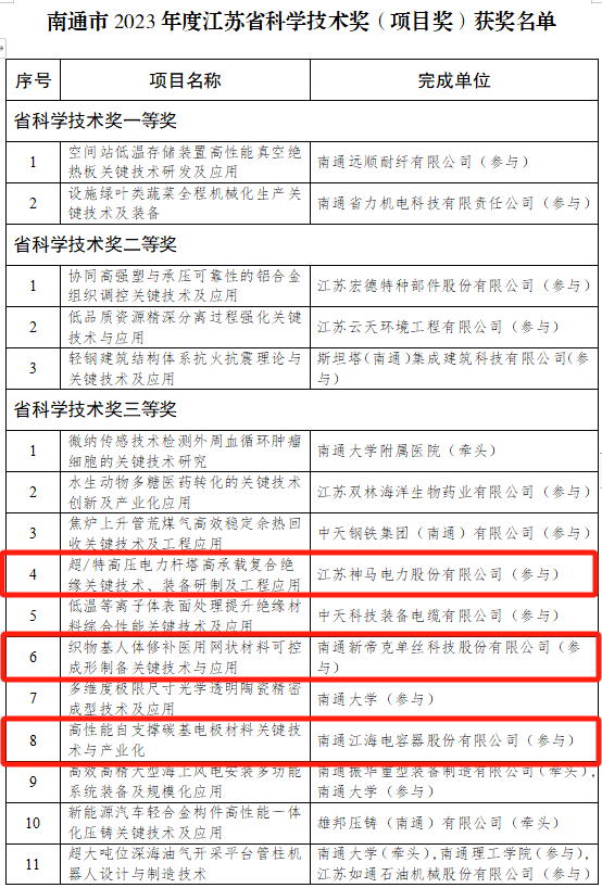 近日,江蘇省人民政府公布《省政府關(guān)于2023年度江蘇省科學(xué)技術(shù)獎(jiǎng)勵(lì)的決定》南通市共有18個(gè)項(xiàng)目榮獲2023年度江蘇省科學(xué)技術(shù)獎(jiǎng)南通市產(chǎn)業(yè)投資母基金已投企業(yè)上榜4家。 其中,通富微電子股份有限公司榮獲江蘇省企業(yè)技術(shù)創(chuàng)新獎(jiǎng)江蘇神馬電力股份有限公司、南通新帝克單絲科技股份有限公司、南通江海電容器股份有限公司各自參與的項(xiàng)目榮獲江蘇省科學(xué)技術(shù)獎(jiǎng)(項(xiàng)目獎(jiǎng))三等獎(jiǎng)。